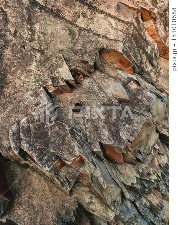 Rock formation showing layered sedimentary rock in pruhonice, czech republic