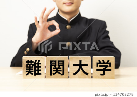 「難関大学」と書かれたブロックとOKサインをする男子学生