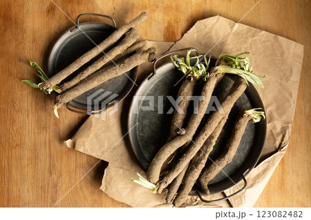 Sprouted scorzonera roots in a metal vintage trays, top view
