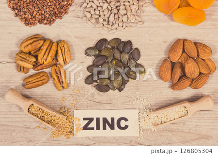 Inscription zinc with healthy food and various ingredients containing vitamins and minerals
