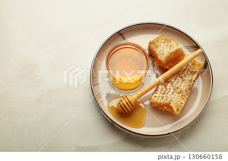 Bowl of sweet honey, dippers and combs on plate on light background.