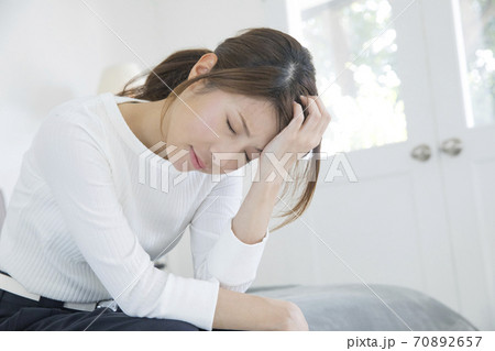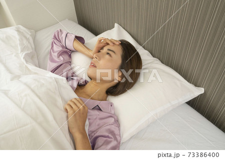 病気で寝込んでいる女性/体調の悪い女性/ベットに寝ている美しい女性/ベッドに座っている美人