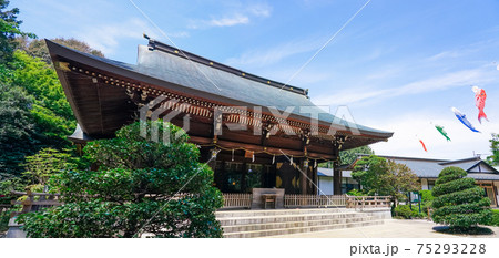 春の青空を背景に、はためく鯉のぼり(喜多見氷川神社)