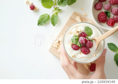 the scene is a bright, overhead shot of a hand holding a glass filled with thick, white substance, topped with several red berries, and fresh green leaves, with grains scattered on