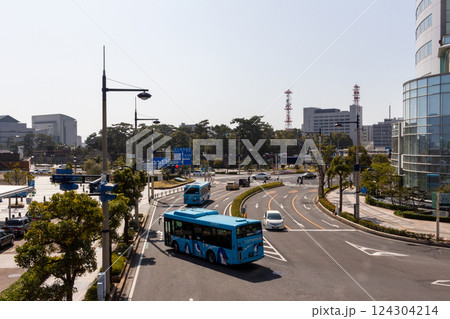 サンポート高松の都市風景 ー 交差点を走ることでんバスと高松城公園の眺め