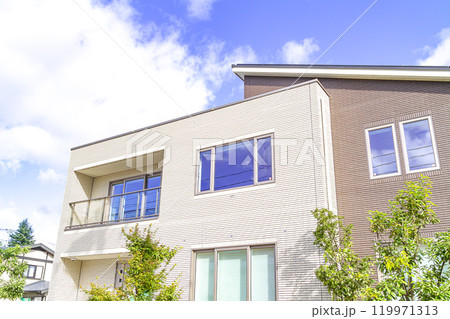 モダンな新築の戸建て住宅モデルハウスのある風景