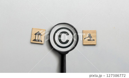 Magnifying glass with copyright logo and icon of law on wooden cubes. Concept of digital copyright and patent, intellectual assets and property, legal protection