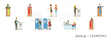 Political election public speech, people character statesman dialogue with electorate flat vector illustration, isolated on white.