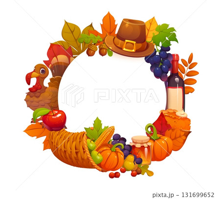 Thanksgiving banner, round frame with autumn leaves, cornucopia and funny turkey, cartoon vector. Thanksgiving holiday banner with pilgrim hat, pumpkins and fruit harvest, acorns and wine in frame