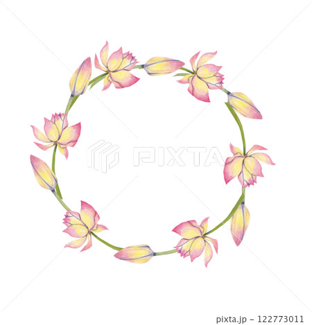 Floral Wreath Illustration with Pink Lotus Flowers, Watercolor Illustration for Printing on Cards, Flyers, Leaflets, Posters, Fabric, Textiles and Social Media Post Design