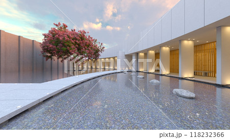 Modern house with glass window, pebble courtyard, round furniture, fire pit, stone wall, tree