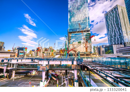 日本の東京都市景観11月19日。デッキの上に組まれていた鉄骨が左端まで…クローラークレーンなど=渋谷