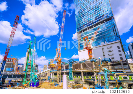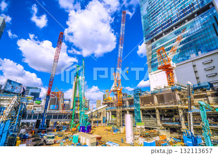 日本の東京都市景観左に鉄骨…クローラークレーンなどの巨大重機がズラリ。左側にも鉄骨が…=17日、渋谷
