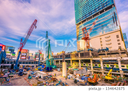 日本の東京都市景観年の瀬。円柱形の構造物の横に“巨大水槽”設置。クローラークレーンなども…=渋谷