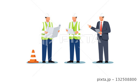 Construction workers and manager discussing site plans with safety cone vector illustration