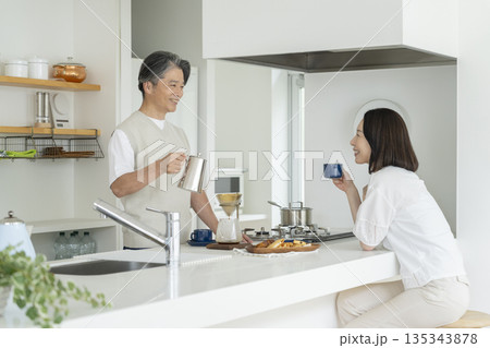 50代の夫婦 イメージ キッチンでコーヒー淹れる男性とコーヒーを飲む女性