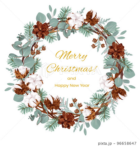 Christmas wreath made of vines, with cotton flowers, eucalyptus, fir branches and cones, thuja.