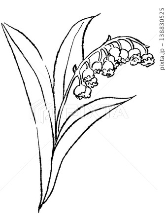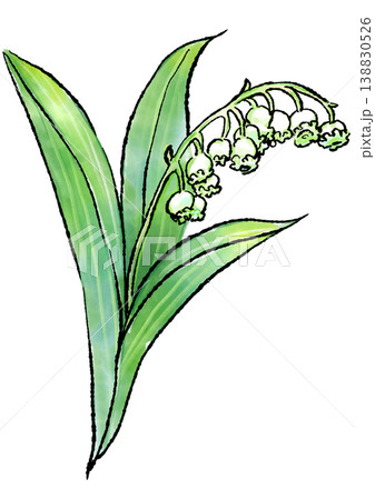 咲き誇るスズランの花の手描きの線画と水彩イラスト