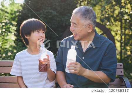 飲み物を一緒に楽しむ孫と祖父