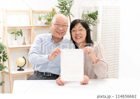 リビングでソファに座るミドルエイジの夫婦のポートレート 正方形