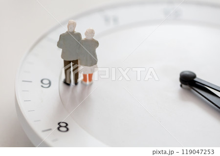 シニアライフ 老後のイメージ 時計の文字盤とシニアカップルのミニチュア