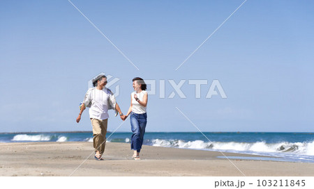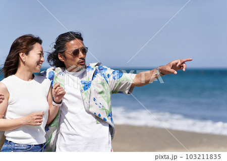 おんぶをしながら海辺を歩くミドルシニアのカップル