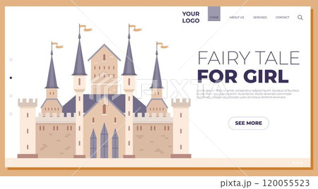 Grand castle with spires and flags set against a light background. Ideal for childrens stories, fantasy themes, girls fairy tales, website designs, and magical adventures. Soft, pastel vector