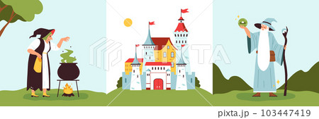 Fairy tale characters and castles from legends for children books and fantasy stories. Hand drawn.