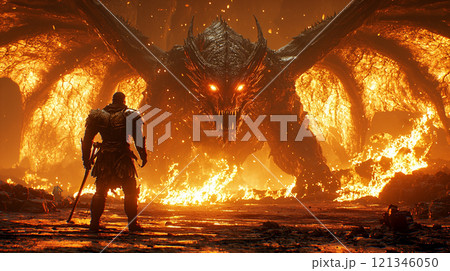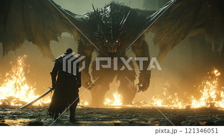Golden knight stands resolute in a burning field, symbolizing sacrifice and heroism.