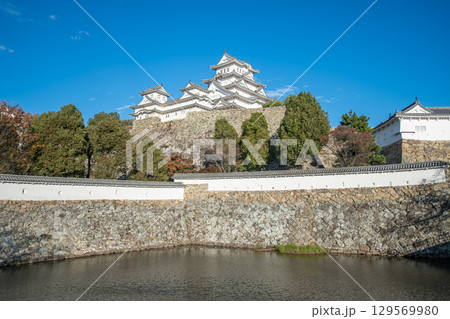 Himeji castle, Historic castle by the water under a blue sky at Himeji, Japan
