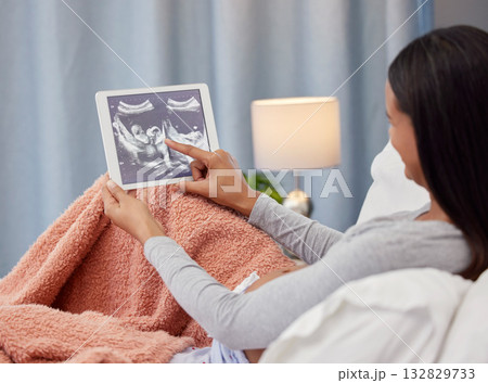 Pregnant, ultrasound scan and mother with tablet in bed with digital x ray of baby, infant and child. Pregnancy love, family home and happy woman excited with prenatal picture on screen in bedroom