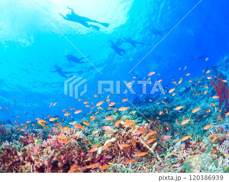 沖縄の美しいサンゴ礁の海でシュノーケル