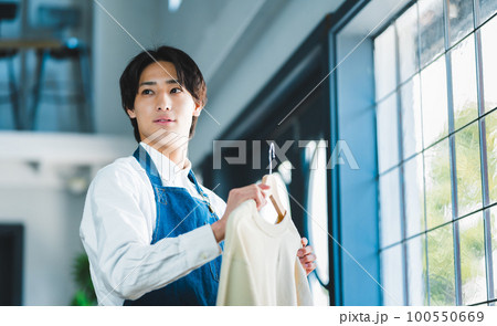 衣料品を持った男性店員