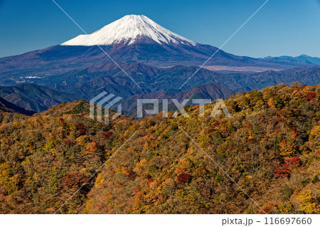 丹沢・鍋割山から見る紅葉の山並みと富士山