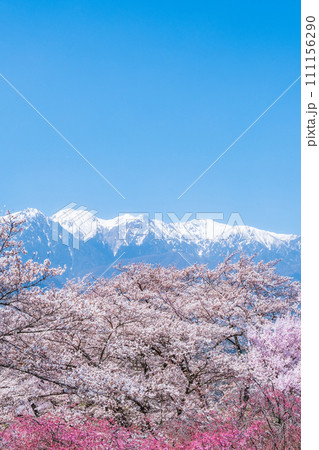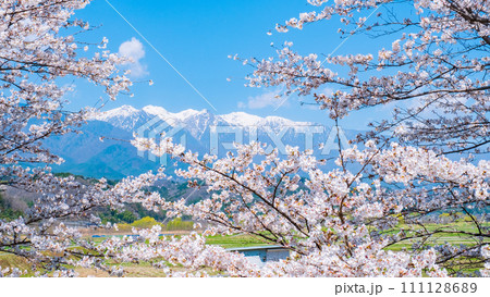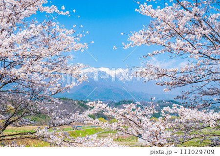 残雪の中央アルプスをバックに桜と水仙が咲く信州伊那谷の春の風景