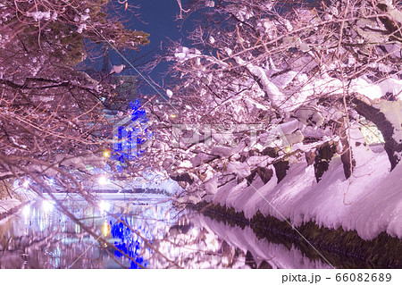 冬の弘前城、ライトアップされたお堀。日本、青森