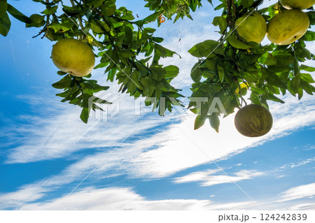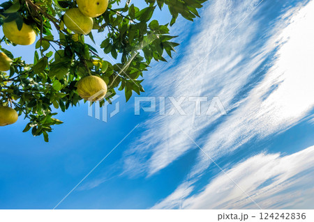 青空に実る柑橘類の果実と広がる雲の景色