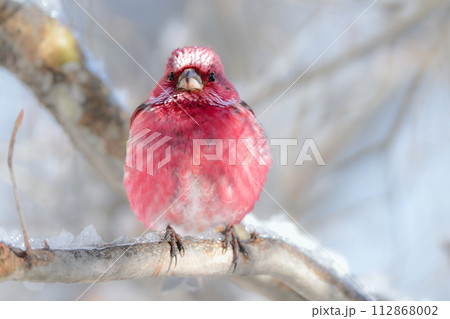 真っ白な高原の雪の森で見られる美しい赤い小鳥オオマシコ