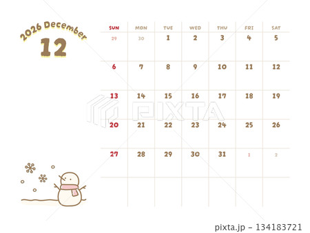 2026年12月カレンダー 冬 雪だるまのイラスト