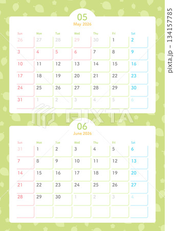 2026年カレンダー 5月と6月 新緑のカラーの背景と葉っぱの模様のパターンイラスト背景