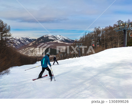 湯ノ丸山を望むスキー場のゲレンデを滑走するスキーヤー (長野県/東御市、群馬県/嬬恋村、湯の丸高原)