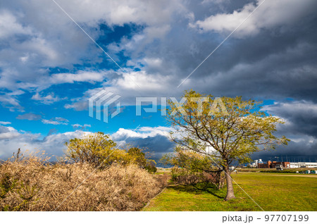 淀川河川公園夕景 空を覆う黒い雲 寝屋川市