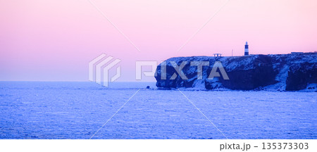 流氷が接岸した夜明け前の北海道網走市のオホーツク海の能取岬