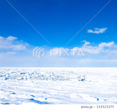 真冬の澄み切った青空と北海道オホーツク海に接岸した一面の流氷
