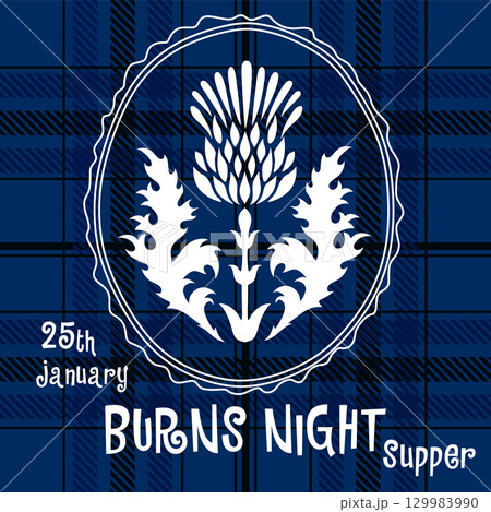 Burns night supper background with thistle on tartan background. Card Menu with lettering for restaurant, party.