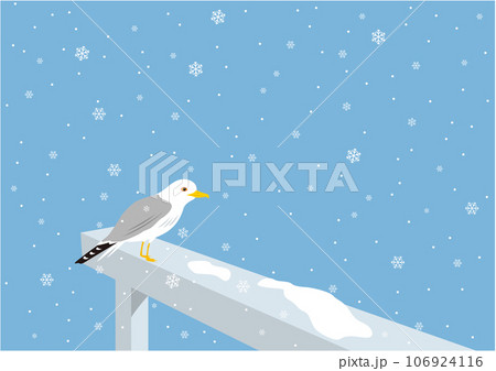 雪の結晶が降る桟橋に止まるカモメのイラスト