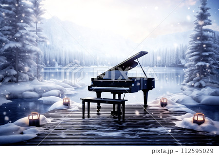 The grand piano on the wood pier in winter season with lake and snow mountains sunrise background in the morning, the concept: a song about winter, music in winter