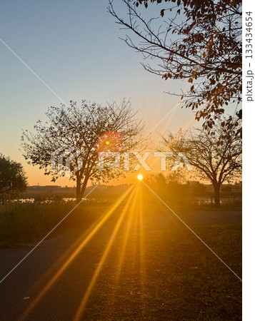 朝日が差し込む道と長く伸びる光芒の風景