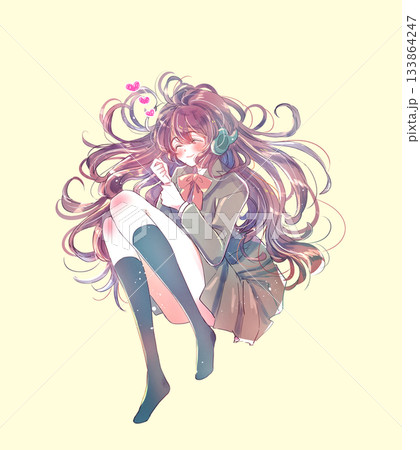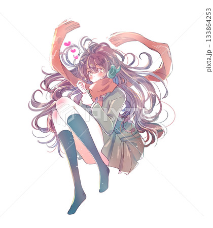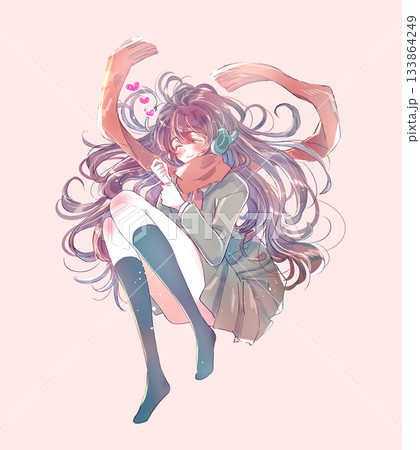 寝転がる女子学生 マフラー ヘッドホン 好き 笑顔