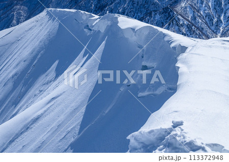 雪積もる谷川岳・稜線上の巨大な雪庇(雪崩危険)